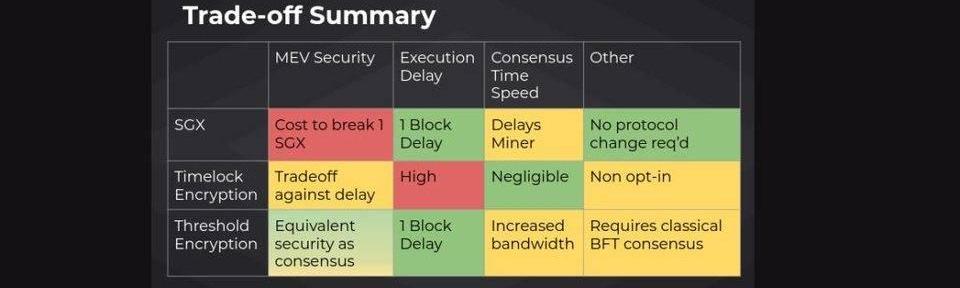 一个解决方案是,交易可以在mempool存储池中加密,并在排序完成后解密。这可以通过受信任的硬件来完成。阈值加密似乎提供了最少的权衡。