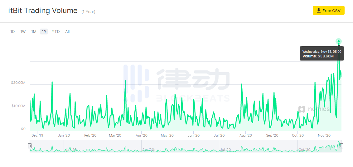 根据 nomics 平台统计,itBit 在 11 月之前的日交易量都在 1000 万美金上下,在 11 月份上旬上涨至 2000 万美金水平,而在 11 月 13 日后,itBit 的单日交易量最高上涨到了 3800 万美金,创年内新高。同时据统计,该平台 BTC/USD 的交易量占全平台的 87%。