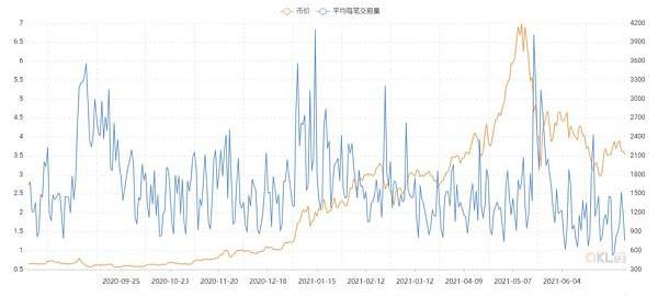 2021年ETH平均每笔交易量大体呈现轻度下降趋势。但其中五月份突然被拉高,与整个市场行情趋同,5月19日该数值为6.69。之后的骤降可能是与监管有关,截至7月20日,该数值为1.82。