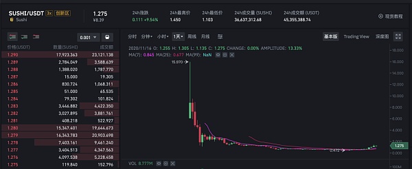 按照Sushi总量2.5亿,流通量1.52亿,总市值为3亿美金,流通市值为1.82亿美金,而相比UNI,UNI的总量10亿,目前流通量2亿,总市值40亿美金,流通市值8亿美金。Sushi价格从15usd的价格一直下降,非常夸张的降幅,直到0.48usd的价格反弹到1.2usd,可以看出Sushi大部分为套牢盘,成本非常高。过低的价格对于大部分资金来说并没有吸引力。