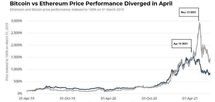 虽然比特币的价格在4月上旬涨幅超过10%,但在4月底,其价格下跌了9%。按照常理来说,这种价格突然下跌本应引发一些危险迹象,但市场似乎忽略了重大回调或市场疲软的警告信号,因为比特币自2012年以来首次出现连续六个月上涨。回想起来,当时市场其实已经释放出了疲软的信号。Coinbase上市的首个交易日就出现价格暴跌,跌幅达到20%,特斯拉还宣布出于资金管理原因出售了10%的比特币头寸。尽管如此,所有迹象仍然指向牛市,因为其他数字货币的表现与比特币的价格表现背道而驰。: