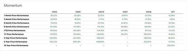 据Seekingalpha统计,在今年以来表现最佳的10只ETF基金中,ARK旗下的三只主动ETF基金入选,ARKG年初至今上涨147%,ARKK年初至今上涨125%……大幅领先同期SPY(标准普尔500)指数。