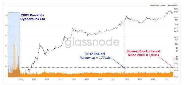 Checkmate说:"这是自2009年加密时代以来最慢的平均出块时间,当时比特币甚至没有市场价格。此前最长的平均出块时间为1774.5s,发生在2017年井喷前的最后回拉底部。"