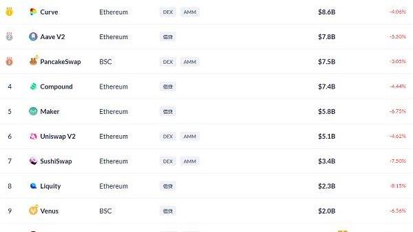 DeFi项目锁定资产前十排名及锁仓量,数据来源:Debank