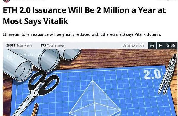 做权益证明(PoS)的原因之一是,是想要大大减少代币的发行量。因此,在ETH2.0的规范中,我们给出了一个计算,如果每个人都参与到以太坊区块链上,那么理论上的最大发行量将是每年200万代币。