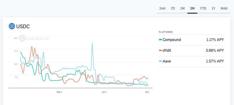 利率可以理解为获取资本的成本,较低的利率意味着获取加密资产的成本更低,这对贷入一方有利,但对借出一方不利。今年早些时候,用户还能够以较高的收益率将加密资产存入DeFi应用之内,收益率有时可以超过10%,但现在,这些利率都在朝着1%下降。