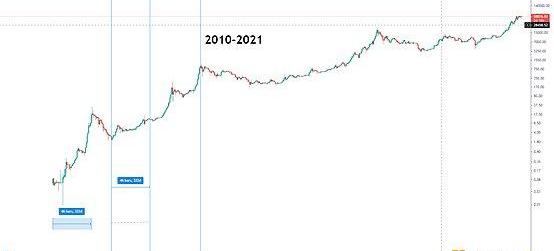 BTC第一轮牛市,从开盘到2011年牛市最高,持续时间46周,后面BTC见顶回落启动熊市,我们可以根据46周的时间周期,通过斐波那锲时间分割比来研究后面几轮牛市BTC见顶的大概时间。