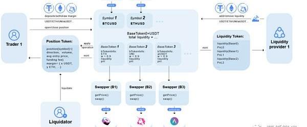 从上面的架构图看出,Deri架构基本上从交易双方出发,一方是交易者,一方是流动性提供者。流动性提供者们为流动性池注入各种代币,同时,交易者有机会构建多种代币的多头或空头头寸。交易者和流动性提供者通过流动性池构成了交易的对手方。此外,还有清算者的和外部兑换协议参与到Deri的系统中来。