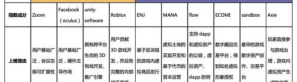 4只上市公司股票和6只NFT虚拟资产平台币的入榜理由展示如下,同伴客数据分析师团队会每个季度重新审核全市场相关股、币的总市值和成长潜力,已决定是否有新的成分项目纳入指数计算之中,或者删除某些曾经入选的项目。此外,市值权重因为是根据市场价格和流通总量每日调整的,会自动考虑在每天的指数介绍之中。