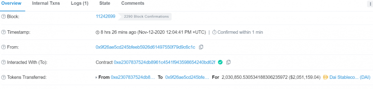 根据 The Block 研究员 Steven Zheng 和 Andrianova 的说法,攻击者从该项目的 yCurve 和 sUSD 储蓄池中取出了 5 万美元的 DAI。攻击者在耗尽这些储蓄池前,收集了价值 200 万美元的稳定币。黑客没有长时间保留被盗的资金,立即将其 转移 到了另一个钱包,如下所示: