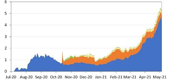 自DeFi于2020年夏季掀起热潮,流动性挖矿已经成了最受密码学货币持有者欢迎的活动。资产管理协议内的锁仓金额在2021年5月远远超过30亿美元,在撰写本文之际达20亿美元。