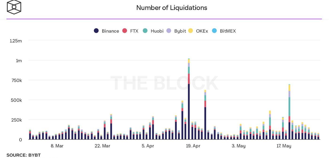 为了了解在DeFi发生的一切,让我们先来看看中心化交易所的清算情况。在最近的市场抛售中,中心化交易所清算最多的一天发生在5月19日。在图2中,我们可以看到中心化交易平台多头的清算金额共计709亿美元。这个数字高于4月22日发生的清算总价值,同时也超过了4月17日发生的90亿美元的清算。4月17日币安有价值47亿美元的仓位被平仓,这可以部分解释5月19日8.7亿美元的平仓量大幅下降的原因。除了清算外,几家中心化交易所也遭遇了技术困难。