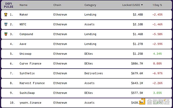 DeFi排名前十锁仓量 数据来源:DeFi Pluse
