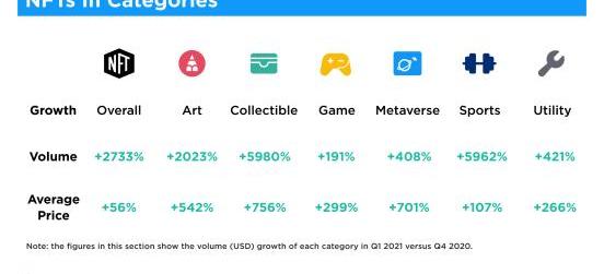 6.?2020年,NFT市场还是由Metaverse主导,相关NFT作品的平均价格大约为500美元;今年,NFT市场内艺术品相关的价格飙升,平均价格达到2500美元,NFT艺术品的平均价格超过了Metaverse相关的NFT。