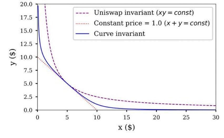 低曲率是要进行权衡的,如果CFMM的曲率为零,则CFMM的报价不会发生变化,而无论交易量是多少。因此,恒定和曲线(如mStable)为CFMM可持有的每个稳定币设置了界限,以防止LP完全持有表现最差的资产。