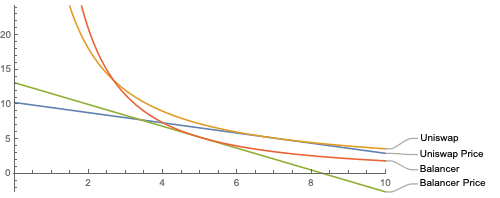 要了解这一点,请考虑下面的示例。我们有一个60:40的Balancer 池以及一个Uniswap池。对于同样价值的储备资金,Uniswap池的的曲率会略低。为了强调差异,我们就假设Uniswap池稍大一些。在下图中,Balancer和Uniswap上的报价从不同的点开始(它们的切线斜率不同)。套利者在一个市场买入,在另一个市场卖出,直到两条切线的斜率相等。请注意,Balancer的价格变化要比Uniswap池子的价格变化更大,但差别并不是很大。这是因为这两个市场的曲率实际上相当接近,尽管Uniswap市场的储备更高,权重也稍为均衡。