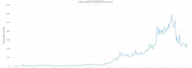 每日交易笔数方面,BSC呈现了一个与Polygon完全不同的数据曲线。具体来说,4月9日,BSC网络的每日交易笔数为4626336笔,6月9日数据为4404475笔,区间整体呈现负增长态势,降幅为4.8%;此外,区间高点数据为5月14日的11281181笔,6月9日数据较区间高点的降幅约为60.95%。