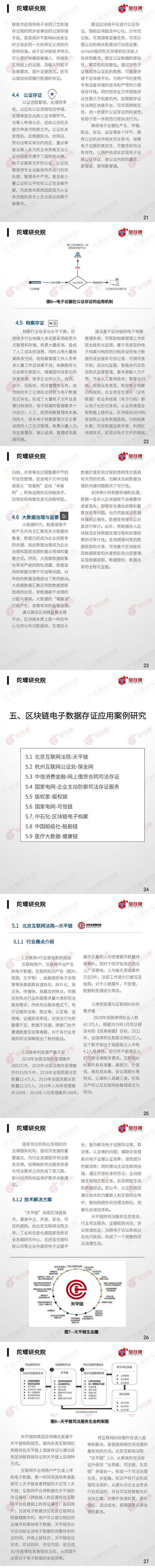 根据以上应用场景,报告中从行业痛点、技术解决方案、项目成效三个维度选取了北京互联网法院-天平链、杭州互联网公证处-保全网、中信消费金融-网上借贷合同司法存证、国家电网-企业主动防御司法存证服务、版权家-版权链、国家电网-可信链、中石化-区块链电子档案、中国船级社-船舶链、医疗大数据-健康链等九大典型案例进行了深入分析。