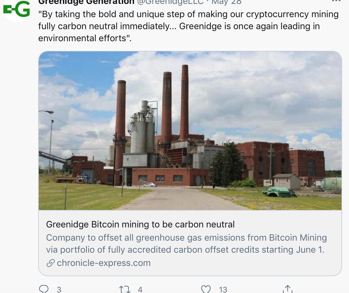 GreenidgeGeneration是一家成立于1937年燃煤发电厂,如今转向更清洁的天然气能源开采比特币。它辩称自己遵守了纽约所有的环保法规。而环保主义者们并不认同,他们认为Greenidge不仅损害地球环境,还将造成纽约气候环境的恶化。尽管Greenidge每天只能开采4个比特币,它已经成为了节能减排人士们的眼中钉。