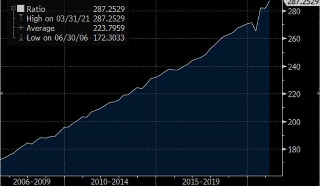 目前,货币供应量相对于经济活动比1974年的峰值低了60%,而且自20世纪80年代初经济开始真正金融化以来,一直在持续但急剧的下降。同时,股市相对于GDP的市值已经从70年代占GDP的40%左右上升到了今天的200%以上,创下历史新高。这也许是我迄今为止说过的所有话中,最需要内化的更令人震惊的事实之一。