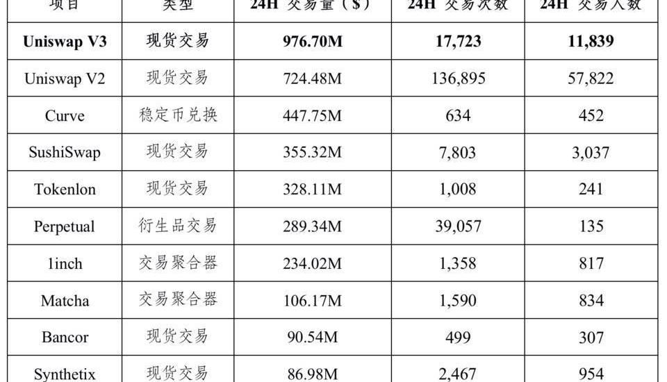 表2中列出了交易类DeFi项目的交易量。从表中可以看出,UniswapV3成为过去24小时中交易量最大的去中心化交易所项目。虽然交易量更大,但UniswapV3的交易次数和交易人数明显低于UniswapV2,这一点能反映出UniswapV3的改进,即聚合流动性的粒度控制更适合进行大额交易。需要指出的是,UniswapV3的锁仓量只有UniswapV2的30%左右,但交易量却超过UniswapV2,可以在一定程度上说明UniswapV3的资金使用率有了明显提高。