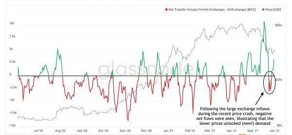 在最近的市场调整期间,交易所看到大量的短期持有者净流入,头寸丢失。随着价格下跌,从/到交易所的净转移量也在下降,甚至在价格下跌接近尾声时再次变为净负值。这表明较低的价格引发了需求,增加了买家逢低期间继续介入的信心。