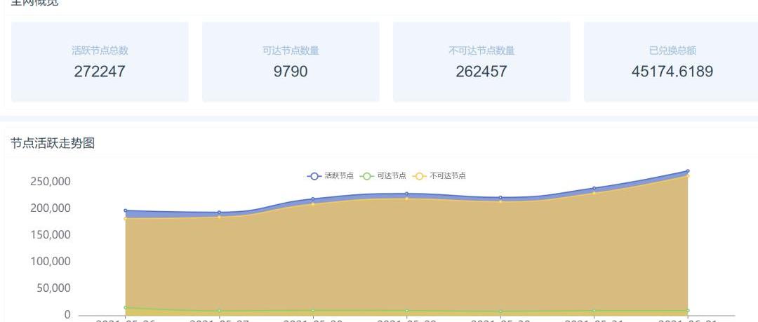 Swarm当前处于测试网尾期,由于测试网有100万个BZZ空投奖励,吸引到众多矿工参与。截止目前Swarm测试活跃节点数超过27万个,节点在全球广泛分布。测试网矿工创建节点后获得不同分值的支票,主网阶段可以用于兑换BZZ。主网上线时间不确定。
