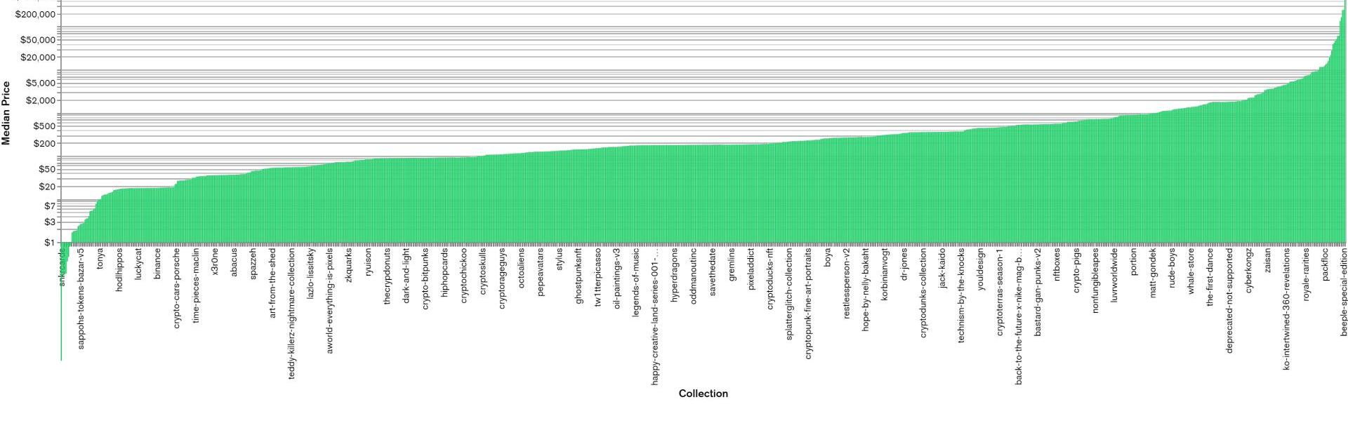 那么,NFT成交价的中位数是多少呢,与人们常说的平均值相比是偏高还是偏低呢?有些人常常把销售NFT比喻成「竞猜」,没人知道它能卖出多少钱。不过,我们可以尝试从一些数据网站上获取销售信息并计算出中位数,以此帮助艺术家们了解到他们究竟能赚到多少钱。