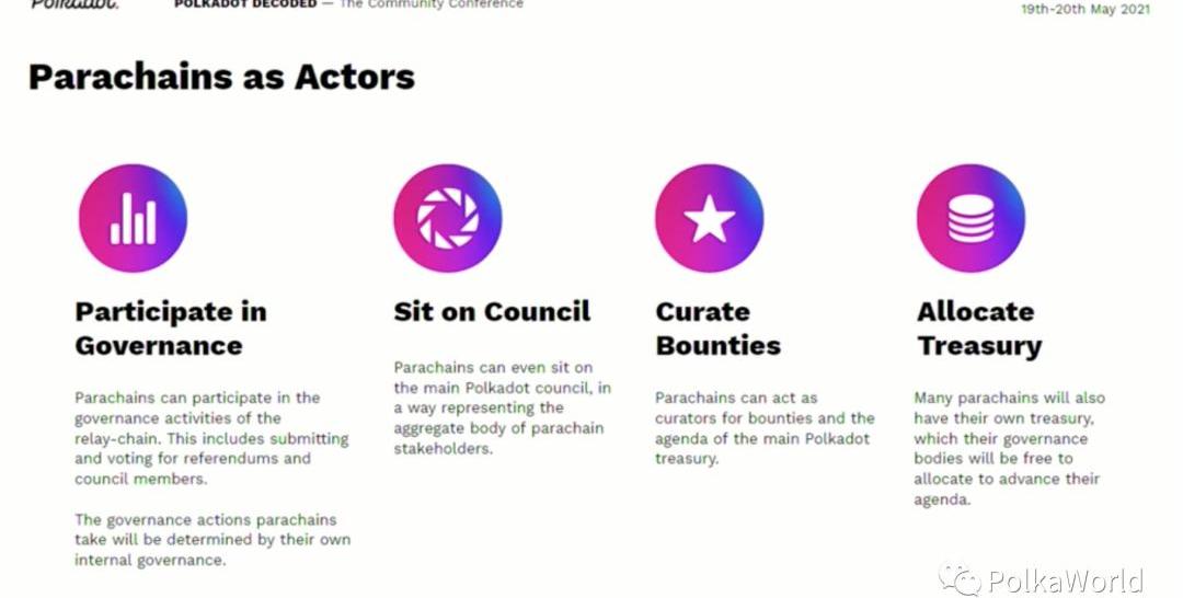 每条平行链可以代表其利益相关者作为一个行为人进行很多活动,如通过提案和投票来参与中继链的治理,成为波卡网络理事会成员,管理赏金任务,分配国库资金等。