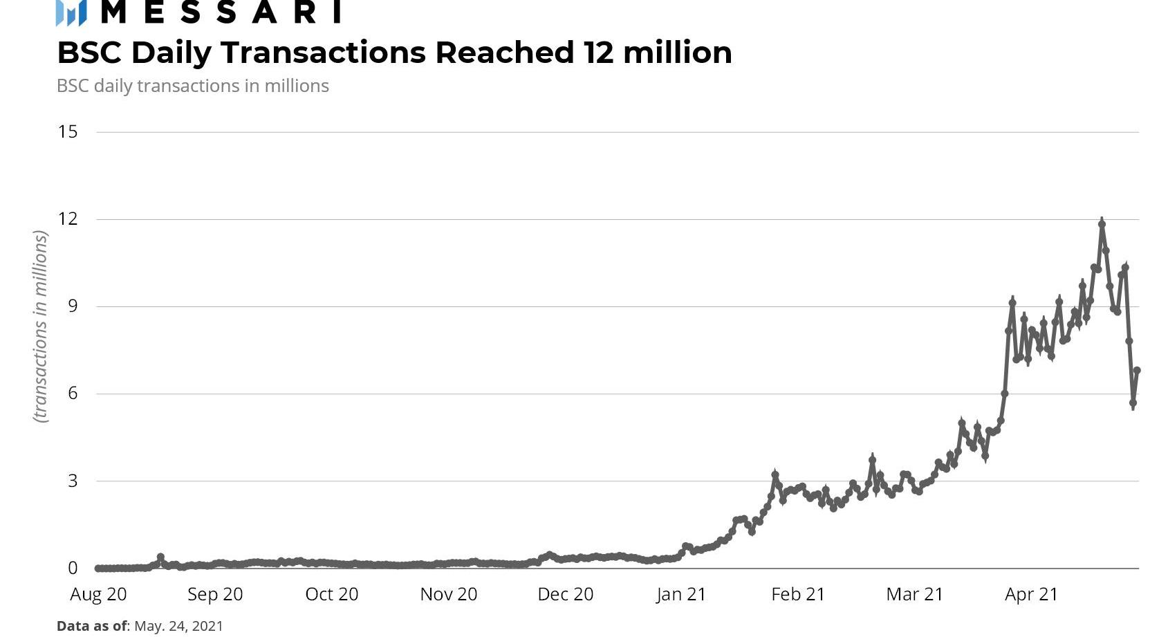 BSC最大的价值主张之一是其廉价的gas费用模式和快速执行。例如,5月18日,以太坊上交换代币的平均成本是~40美元,而在BSC上是~0.2美元。高昂的gas费用对许多零售用户来说过于昂贵,因此,在过去的几个月里,BSC网络在几乎所有的关键指标上都享有抛物线式的上涨。据下表显示,BSC网络的日活跃地址,即衡量作为发送方或接收方在网络上活跃的唯一地址,在2021年5月从不到100个增加到了超过100万个,甚至已经超过了以太坊网络的地址。