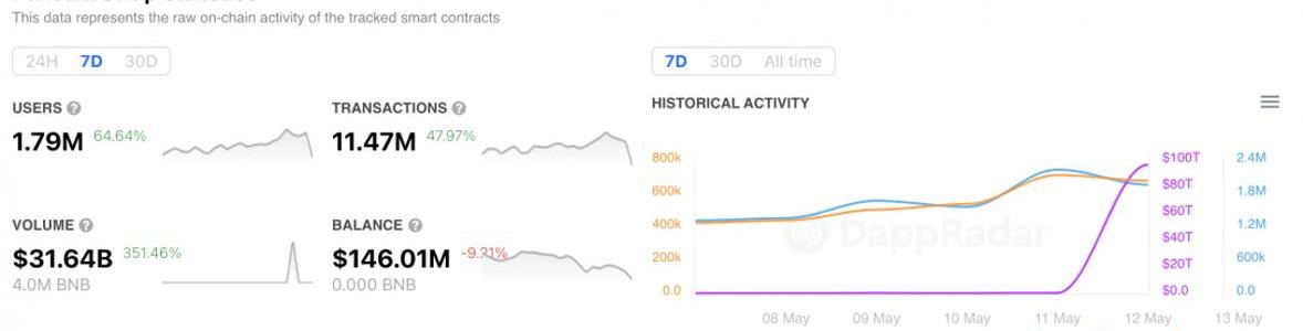 5月13日,据DappRadar报道,在过去的7天里,与PancakeSwap智能合约互动的活跃钱包数量成倍增长,达到179万,比一周前增长了65%。同时,PancakeSwap平台上的交易数量猛增到超过1150万,交易量增加了两倍多,达到320亿美元。