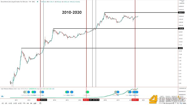 回顾历史,从BTC长期历史走势图可以发现,第一次产量减半2012年11月,之后的3个月时间BTC便突破了2011年全年顶点,刷新历史新高,后面价格一路势如破竹,形成了2013年的大牛市。在2016年的7月的第二次产量减半启动后,用了6个月的时间币价先是触碰13年顶点而后回落蓄势,最终在第二次减半后的第9个月,也就是2017年的4月份,价格强势突破2013年顶点,再次刷新历史新高,后面走出了2017年的大牛行情。