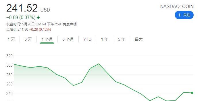Coinbase的股票也因此遭遇抛售。该股目前的股价为241.5美元,低于4月份直接上市时250美元的参考价格,更远低于上市首日达到的峰值429.54美元。