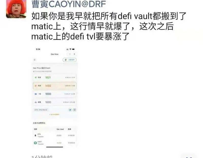 此前的极端行情中,以太坊一层网络的gas费用一度飙升至1000Gwei以上,这也给Polygon拉来了新一轮的关注。业内知名投资人、数字文艺复兴基金会董事总经理曹寅在个人朋友圈就表示,如果不是自己早就将所有DeFi仓位搬到了Polygon上,这种极端行情下很可能遭遇清算,因此预计在这场黑天鹅过后,Polygon网络上的资金锁仓量将继续飙升。