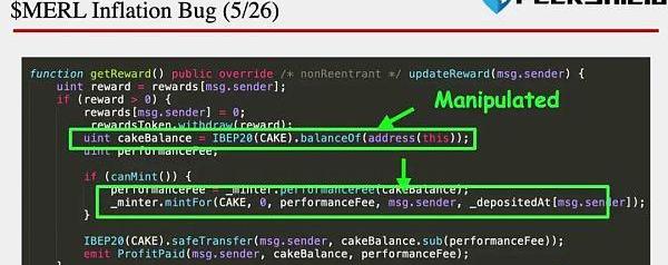 这一次,攻击者没有借闪电贷作为本金,而是将少量BNB存入PancakeSwap进行流动性挖矿,并获得相应的LPToken,Merlin的智能合约负责将攻击者的资产押入PancakeSwap,获取CAKE奖励,并将CAKE奖励直接到CAKE池中进行下一轮的复利;攻击者调用getReward()函数,这一步与BUNNY的漏洞同源,CAKE大量注入,使攻击者获得大量MERLIN的奖励,攻击者重复操作,最终共计获得4.9万MERLIN的奖励,攻击者抽离流动性后完成攻击。