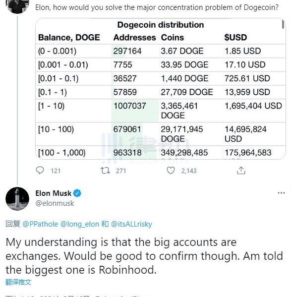 对此,马斯克回复称「这大账户应该是交易所的,也许可以去确认一下,我被告知最大的账户应该是Robinhood。」