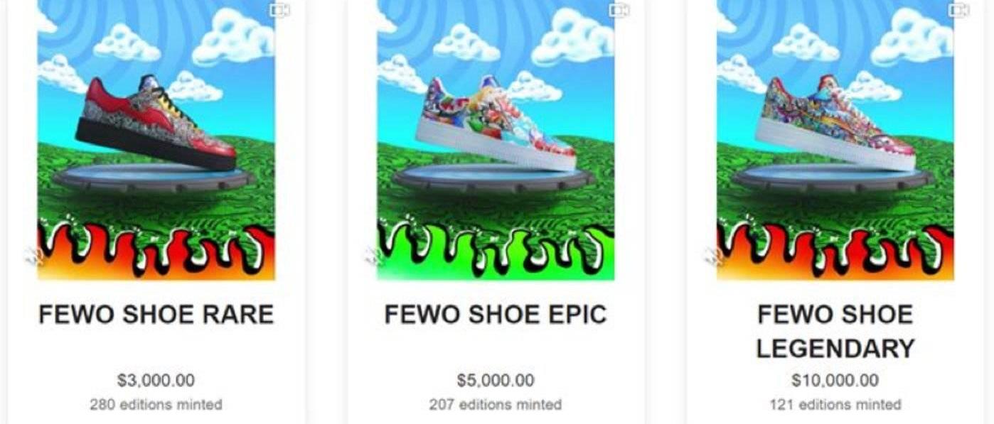 今年3月,RTFKTStudios与18岁加密艺术家Fewocious推出联名鞋款,仅开卖七分钟便售出600余双,总价值超过310万美元,平均计算每双球鞋价值达到了4992美元。