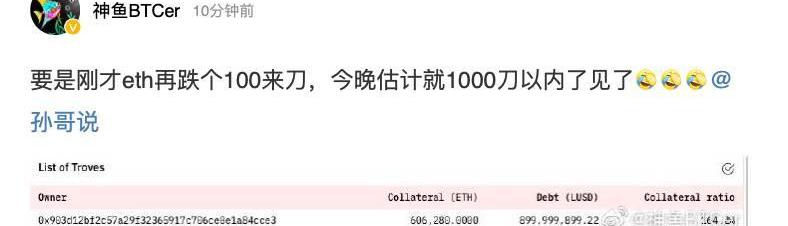 根据神鱼的爆料,如果ETH再跌100多美元,孙宇晨的60多万个ETH就将清算爆仓,届时将把ETH价格进一步打压至1000美元以下。?