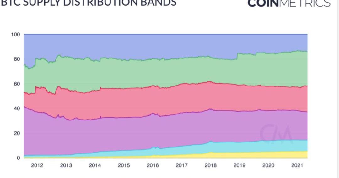 最后,我们增加了一套供应分布指标。下面的图表显示了不同范围的地址所持有的BTC总供应量的百分比。从图表底部往上看,第一个区间显示了由持有0到1个BTC的地址控制的百分比,下一个区间显示了由持有1到10个BTC的地址控制的供应量。
