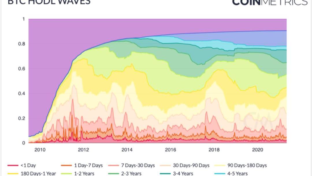 BTC年龄分布带,也被称为"HODL波",显示了BTC的供应量,按其最后一次在链上移动后的时间分组。HODL波给出了一个BTC供应量多年来变化的宏观视图。