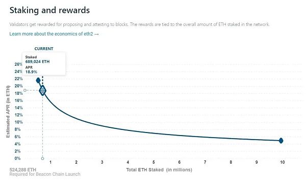 而创世之后,Eth2每天将只能增加900位验证者。Alexander Fisher计算的不同时期的质押年化收益率走势也显示:越早参与质押,成为Eth2的验证者,将获得更高的年化收益率。