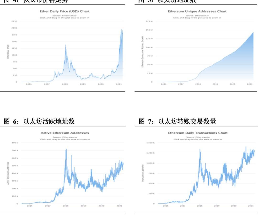 从价格走势看,以太坊在2020年稳步上升,从年初129美元上涨至737美元,涨幅接近471.32%。2020年12月,ETH2.0信标链正式上线,拉开以太坊2.0的序幕。以太坊2.0是以太坊发展的重要阶段,将从根本上改变共识算法,并引入分片机制和更新执行环境。以太坊2.0致力于解决以太坊网络一直被诟病的可拓展性和交易效率等问题,有助于提升以太坊的可用性,丰富应用生态版图。