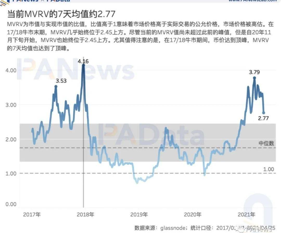 17/18年牛市顶峰期,MVRV指数的峰值为4.16,指标峰值出现的时间与币价峰值同步,且在峰值出现前半年左右的时间里,该指标始终位于2.45上方,高位运行。当前,MVRV的指数约为2.77,最近5个月左右的时间里,该指标始终高于2.45,这说明,当前的市场价格持续高于实际交易的公允价格。