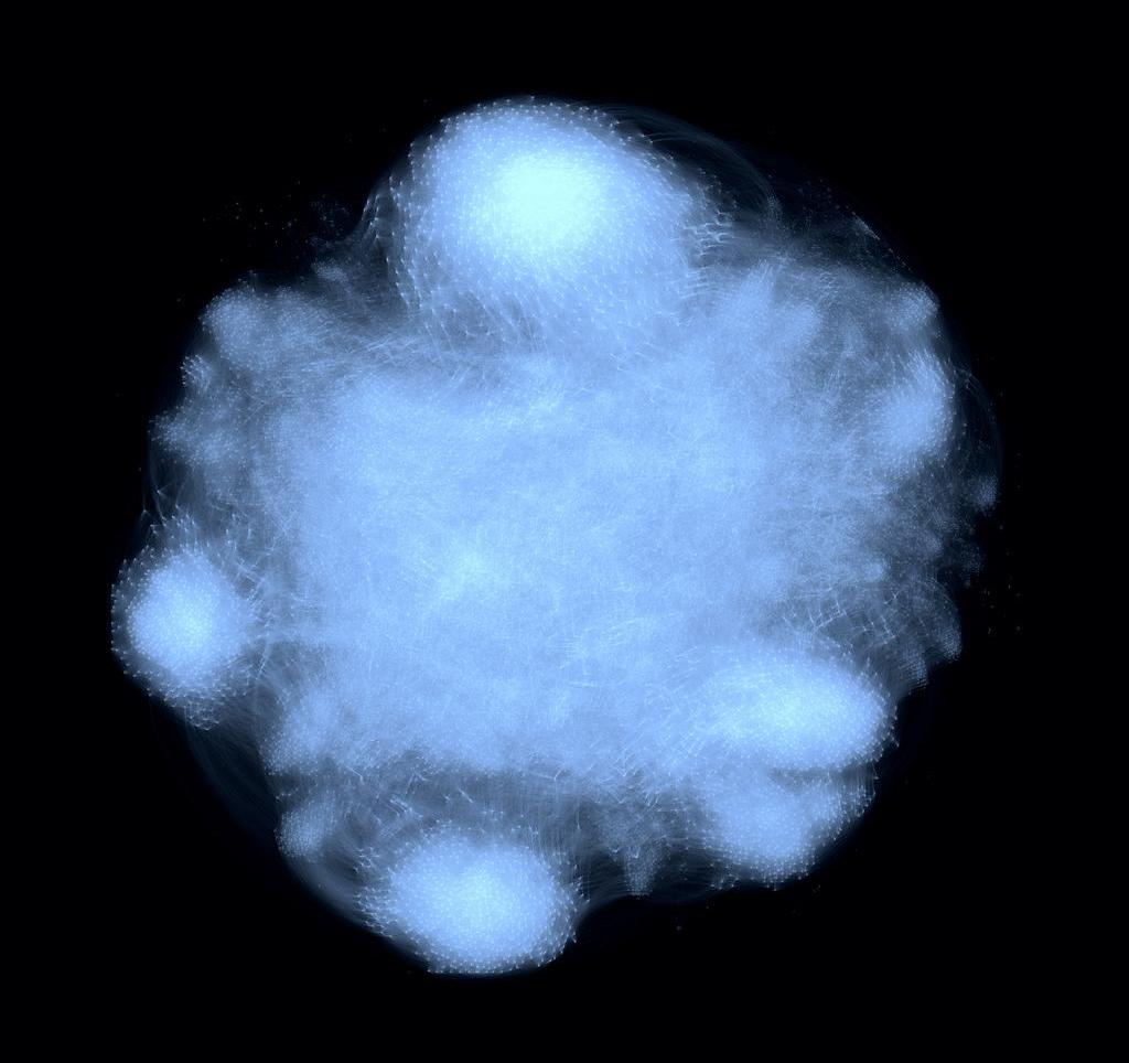 正如你所看到的,这个网络有几个大型的、容易被发现的"社区"——相互之间紧密联系的艺术品集群。这些社区代表什么?起初,我们怀疑它们是基于NFT的各种子类型的艺术作品的集合,表现出视觉或概念上的相似性,从而吸引了具有相似品味的收藏家。为了验证这一猜测,我们给每个节点分配了一种颜色,对应于创作该作品的艺术家。但是,由此产生的色彩混乱并没有证实这一假设。虽然在这些社区中,似乎存在着对某些艺术家的轻微偏好,但这种模式似乎是偶然的,而不是解释性的。