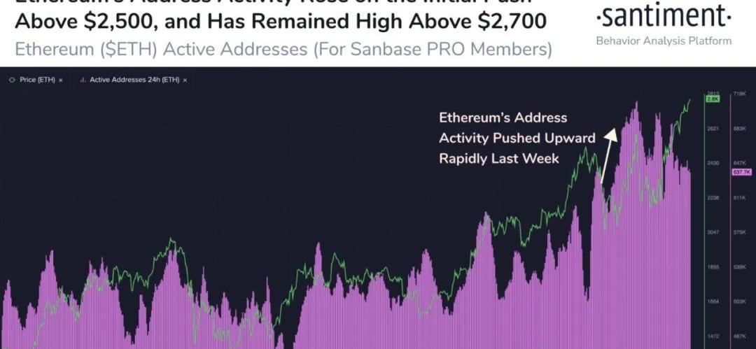 在上周的下降趋势中,当ETH发现自己同样进入了下跌状态时,价格下跌至了约2200美元。但是它很快实现了反弹,有趣的是,在相似的时间范围内,以太坊的地址活跃度也非常明显的出现了大量增加,最终导致价格达到了新的ATH。