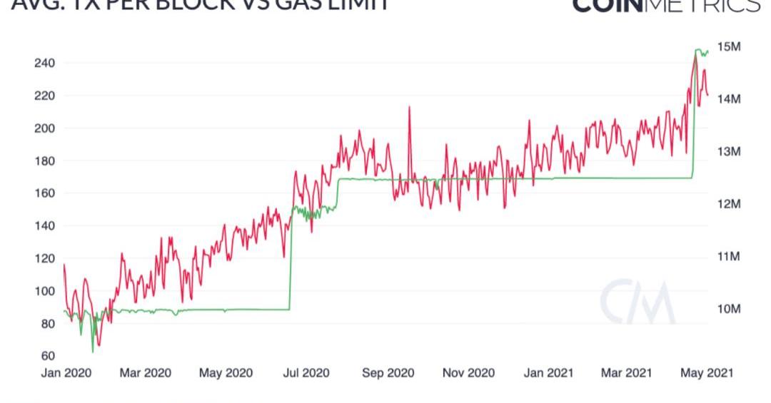 以太坊区块平均交易量和gas上限对比