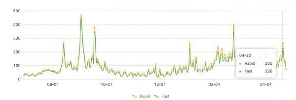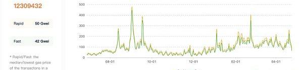 根据Gasnow网站数据显示,4月25日,“快速”交易的gas价格为42Gwei。4月20日,在“快速”模式下,Gas平均gas价格为226Gwei。在过去5天,Gas价格下降了81%。这是2021年以来的最低位。