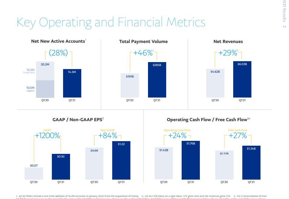 另外,Paypal本季净营收为60.3亿美元,同比增长31%;每股盈余1.22美元,分别优于分析师预期的59亿美元和1.01美元。且本季新增1,450万新用户,成长率21%,目前总计达3.92亿用户。
