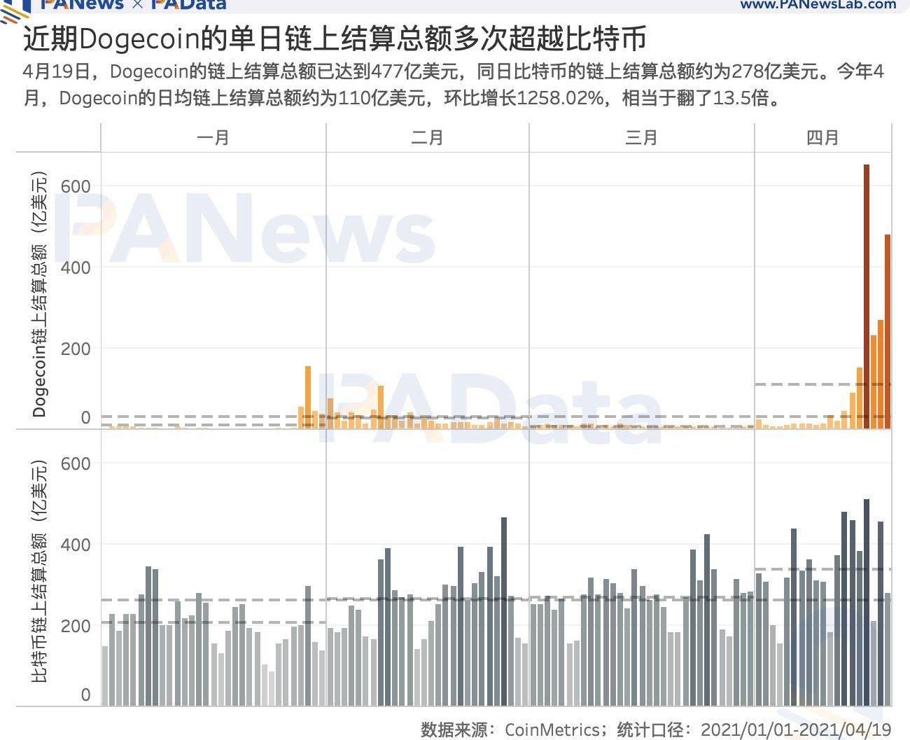 如果综合考虑每月日均活跃地址与日均交易次数的比值的话,可以发现,今年以来,Dogecoin每1万个活跃地址的交易次数从4210.53次微涨至4467.57次,涨幅约为6.10%。而比特币每1万个活跃地址的交易次数则从2836.81次微跌至2559.02次,跌幅约为9.79%。整体而言,两个网络中活跃地址的活跃度都基本保持稳定,但Dogecoin活跃地址的活跃度略微有所上升。另外值得关注的一点是,近期,Dogecoin的链上结算总额多次超过比特币。比如,4月16日,17日和19日,这三天Dogecoin的链上结算总额分别约为649.2亿美元、229.3亿美元和477.3亿美元,而同日比特币的链上结算总额分别约为509.8亿美元、209.6亿美元和278.7亿美元。