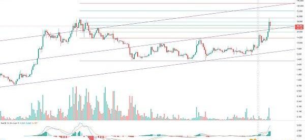 突破长期周线压制线的正常回踩,整体仍是多头向上,后续行情整理后有望继续尝试新高,若有回落25美金附近的机会建议低吸,耐心持有。